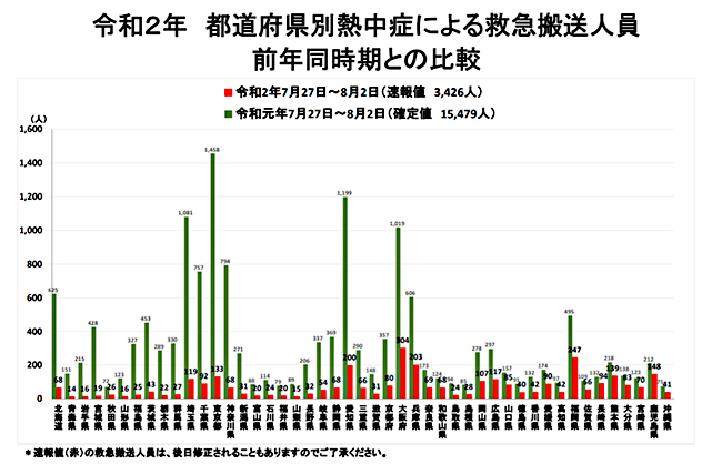 昨年の同時期はすでに猛暑日が続いており、救急搬送者数は1万5479人だった。それと比較すると5分の1程度に抑えられている。梅雨明けが例年以上に遅かったことに加えて、新型コロナウイルス感染再拡大による外出自粛が影響しているようだ。