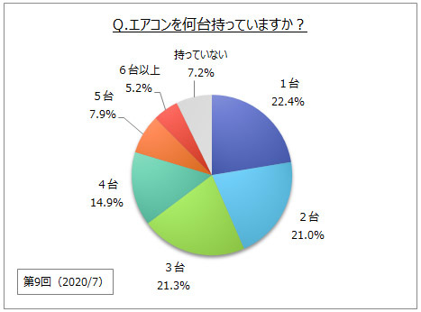 所有台数の内訳は、1台が22.4%、2台が21.0%、3台が21.3%とそれぞれ2割台で並んだ。さらに、4台も14.9%と多く、続いて5台(7.9%)、6台以上(5.2%)となっている。エアコンの「3台」や「4台」持ちは、それほど珍しいことではないことが分かる。