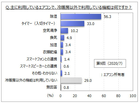 冷暖房以外で使っている機能についての質問では、「除湿」が56.3%と圧倒的に多かった。7月初旬に実施したアンケートとあって、長梅雨の影響が反映されているのかもしれない。次に「タイマー」が33.0%、「空気清浄」が10.2%、「換気」が4.9%、「加湿」が3.4%、「衣類乾燥」が3.4%だった。