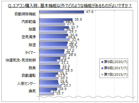 最後にエアコンを購入する際、冷暖房などの基本機能以外であったらいい機能(複数回答)は、1位が「自動掃除機能」で47.6%と多く、フィルターの掃除機能に対する根強いニーズがあることを示した。ほかにも、「内部乾燥」「除菌」「空気清浄」「除湿」が各30%台だった。