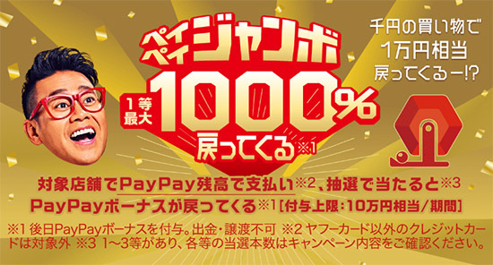 8月3日からPayPayが実施しているのは「まちのお店でペイペイジャンボ」。対象店舗は指定した中小規模の加盟店で、抽選で決済金額に応じたポイントが還元される。内訳は、1等が1000%(決済金額の10倍)で7200本、2等が100%(決済金額の全額)で2万6100本、3等が5%で286万9300本。還元上限は10万円相当/期間。
