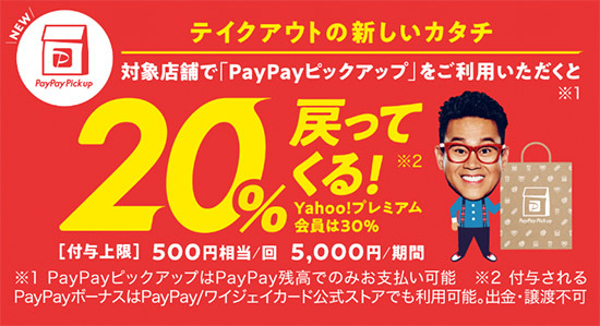 8月17日からは、テイクアウトサービス「PayPayピックアップ」限定のキャンペーンもスタートする。対象店舗で同サービスを利用すると20%還元(Yahoo!プレミアム会員は30%還元)するというもの。還元上限は500円相当/回、5000円相当/期間。