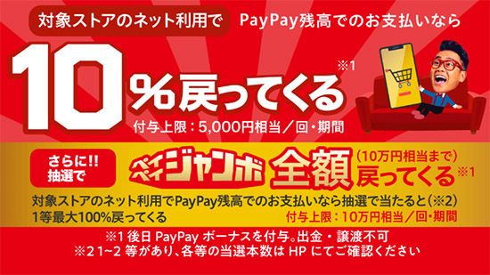 9月分のキャンペーンも、8月6日に発表された。対象は指定のオンライン加盟店で、決済金額の10%を還元する「またまたオンラインがお得!10%戻ってくるキャンペーン」と抽選で最大全額が戻ってくる「ペイペイジャンボ(オンライン)」を同時開催する。