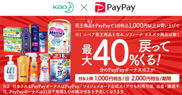 9月はもう一つ、「花王」とのコラボキャンペーンも見逃せない。対象店舗で花王商品(カネボウ化粧品、花王ソフィーナ以外)を購入すると、40%還元するというもので、高還元率が魅力だ。還元上限は1000円相当/回、2000円相当/期間。