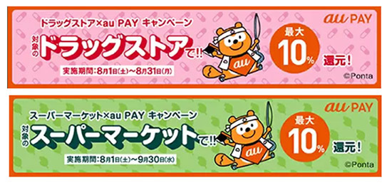 au PAYは「ドラッグストア×au PAYキャンペーン」(8月1~31日)、「スーパーマーケット×au PAYキャンペーン」(8月1日~9月30日)を実施中。ポイント還元上限は、ともに1au ID当たり1回500ポイント/月1500ポイント。