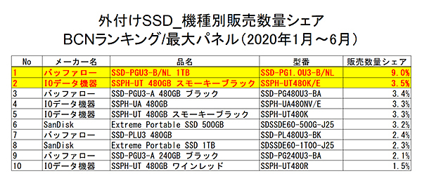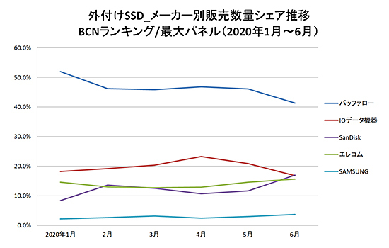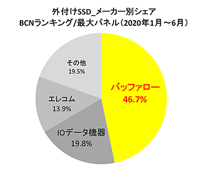 全国の家電量販店やECショップのPOSデータを集計する「BCNランキング」によると、2020年上半期(1月~6月)の外付けSSD市場で、最も販売数量シェアが高かったのはバッファローだった。2位と26.9ポイント差の46.7%で20年を折り返した。