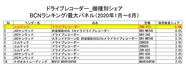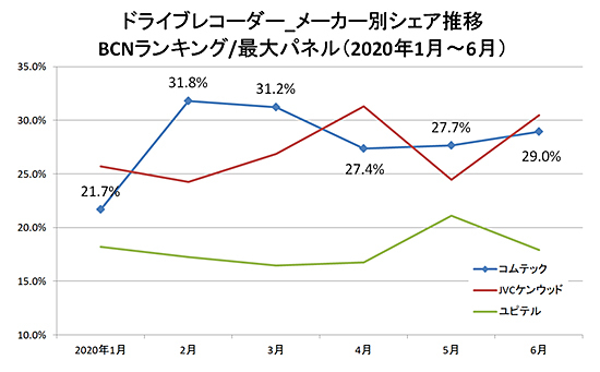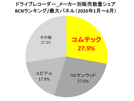 全国の家電量販店やECショップのPOSデータを集計する「BCNランキング」によると、2020年上半期(1月~6月)のドライブレコーダー市場で販売数量シェアが最も高かったメーカーは、コムテックだった。2位とは0.9ポイントと僅差の27.9%。シェア推移も混戦模様で、今後の展開が注目される。
