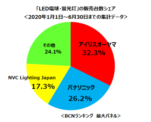 全国の主要家電量販店・ネットショップのPOSデータを集計した「BCNランキング」の2020年上半期(1~6月)の集計データで、「LED電球・蛍光灯」部門のトップを射止めたのは販売台数シェアが32.3%のアイリスオーヤマだった。2位のパナソニックのシェアは26.2%で、6.1ポイント差の開きがあった。