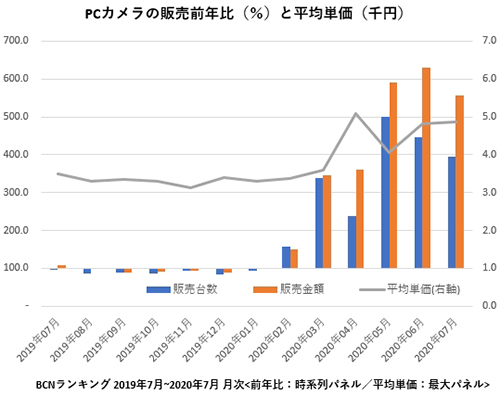 ネット会議の急速な普及で、USB接続のPCカメラが売れに売れている。BCNランキングによると、需要が高まったのは新型コロナウイルス感染症が拡大し始めた今年2月。1月まで前年並み水準で推移していた市場は、2月に販売台数が前年比で1.5倍、3月には3.4倍と拡大。緊急事態宣言が発出された4月は品薄から、いったん2.4倍とやや伸び悩んだものの、5月に5倍、6月に4.5倍、7月に3.9倍と好調だ。3000円台だった税別(以下同)平均単価も5000円程度まで上昇しており、6月の販売金額は前年比6.3倍を記録した。