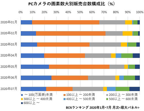 ネット会議の需要が立ち上がる直前の1月は、販売台数のうち66.0%が200万画素未満の比較的低価格の製品が占めていた。以降、100万画素未満の低価格製品の構成比は「急場しのぎ」での購入で拡大したものの、200万画素超の製品の構成比も拡大。7月では、200万画素以上の構成比が56.5%と逆転した。特に500万画素台の高画質カメラの構成比が11.6%に拡大し、売れ筋の仲間入りを果たした。