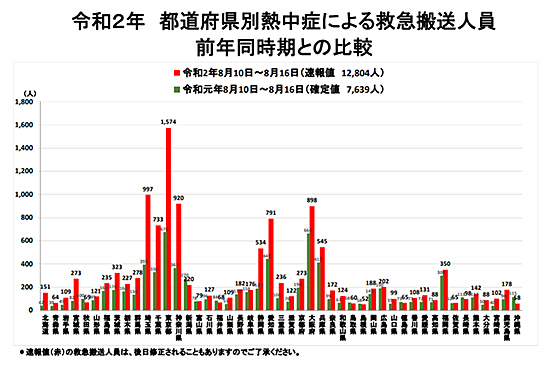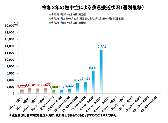 総務省消防庁が発表している熱中症情報によると、8月10日~8月16日の1週間に全国で熱中症で救急搬送された人数は速報値で1万2804人で、前週の6664人から倍増した。