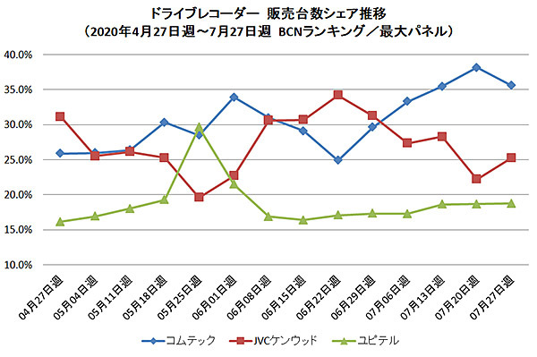 メーカー別の販売台数前年比はコムテックが119.7%、JVCケンウッドが75.3%、ユピテルが128.3%。週次の推移では、7月に入ってコムテックが巻き返し、後半に35%を突破。JVCケンウッドとの差を広げた。3番手のユピテルは6月以降、15~20%で推移している。