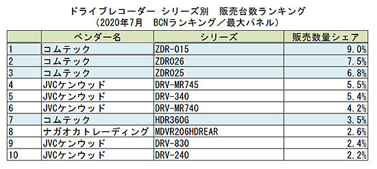 機種別の販売台数シェアランキングでは、コムテックがトップ3を独占。定番の「ZDR-015」が1位に立った。一方、JVCケンウッドもベストテン圏内に5製品がランクインしており、夏以降も両社によるトップシェア争いは続きそうだ。(BCN・大蔵 大輔)