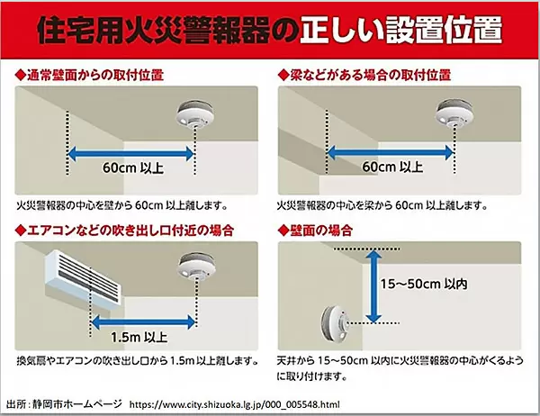 また、住宅用火災警報器には正確に火災を検知するために、壁面や梁から60センチ以上、エアコンの吹き出し口から1.5メートル以上、壁面設置で天井から15~50センチ以内に離して設置するなど、正しい設置位置が決まっている。