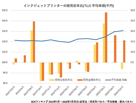 4月、5月はテレワークに移行し、急場しのぎの印刷環境を整備するため、比較的低価格のプリンタ需要が高まった。例年にない需要の発生で低価格製品から品薄状態になっていったことで、単価が上昇。台数の需要が収まってきた現在も、比較的単価が高い製品が引き続き買われている、という状況だ。プリンタ用のインクの需要はプリンタ本体ほど伸びておらず、押しなべて少量印刷の需要が一時的に伸びた状態といえそうだ。