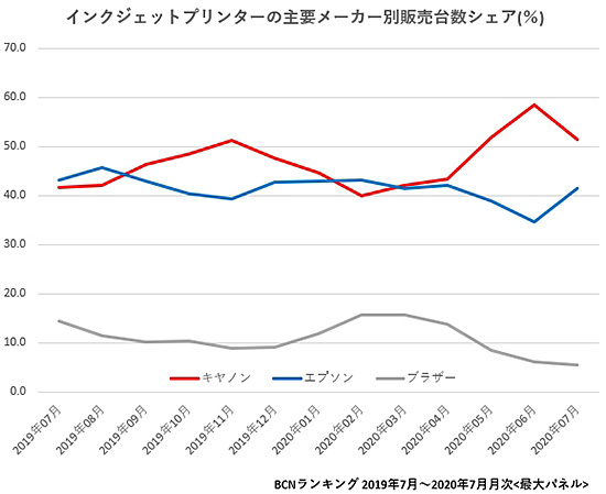 メーカー別の動きを見ると、コロナ禍でプリンタの販売を伸ばしたのがキヤノンだ。今年に入って4月まではライバルエプソンと販売台数シェアでほぼ互角の40%台で競っていたが、5月に51.9%、6月に58.5%と6割に迫る勢いで販売を伸ばした。7月にはシェア差が縮まったものの、51.4%と過半を占めている。