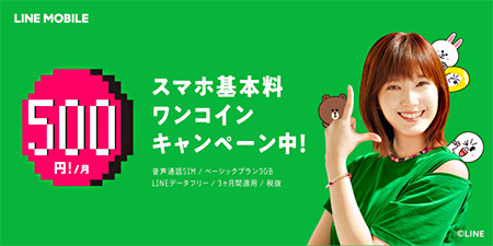 LINEモバイルは、MVNO(仮想移動体通信事業者)事業「LINEモバイル」で格安スマートフォン(スマホ)を月額ワンコインで始められる新キャンペーンとして、ベーシックプラン(音声通話SIM・3GB)・LINEデータフリーでの申し込みで月額基本利用料が3カ月500円(税別)になるキャンペーンや、「LINEクリエイターズスタンプ」が使い放題になる「LINEスタンプ プレミアム」が最大2カ月分実質無料になるキャンペーンなどを新たに開始する。