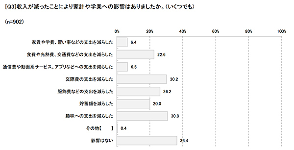 減った収入を補うため、生活を切り詰めるケースも出てきている。家計や学業への影響も複数回答で集計したところ、もっとも多かったのは「趣味への支出を減らした」で30.8%だった。