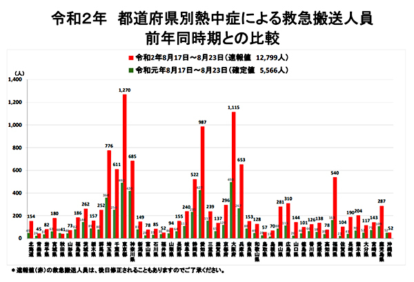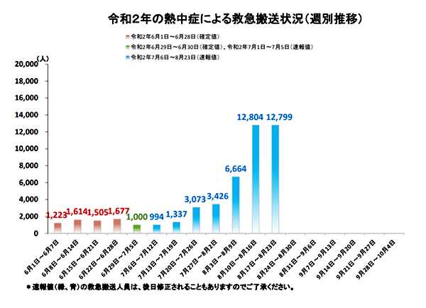 総務省消防庁が発表している熱中症情報によると、8月17~23日の1週間に全国で熱中症で救急搬送された人数は速報値で1万2799人、前週の1万2804人からほぼ横ばいで推移した。