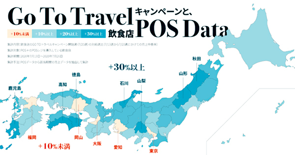 クラウド型モバイルPOSレジの「POS+(ポスタス)」を提供するポスタスは、「GO TO トラベル」キャンペーンの飲食店への影響度合いについて7月度のPOSデータを基に調査し、8月25日に結果を発表した。