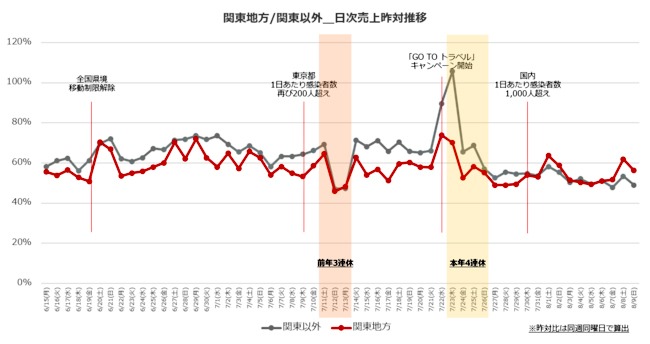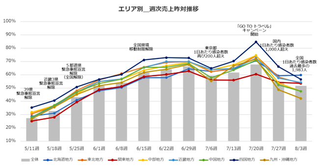7月9日から東京都の1日当たりの感染者数が200人を超え始め、売り上げが全国的に落ち込みを見せた。7月22日開始のGO TO トラベルキャンペーンや4連休の影響で、7月20日週は全体の昨対比が68%まで引き上がった。ただし、東京都がキャンペーン対象外となった関東地方は60%にとどまっており、顕著に差が出る結果となった。
