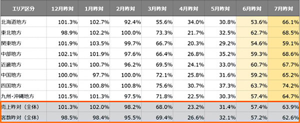 6月は、5月25日の全国緊急事態宣言解除から客数・売り上げが同推移で上昇、6月末時点で70%近くまで回復した。エリア別で見ると、北海道地方、関東地方が全国平均を下回っている。5月25日の緊急事態宣言全国解除から客数・売り上げともに上昇したが、昨対比65%近くに達したところで推移が鈍化。エリア別で見ると、北海道地方・関東地方が全国平均を割る結果となった。
