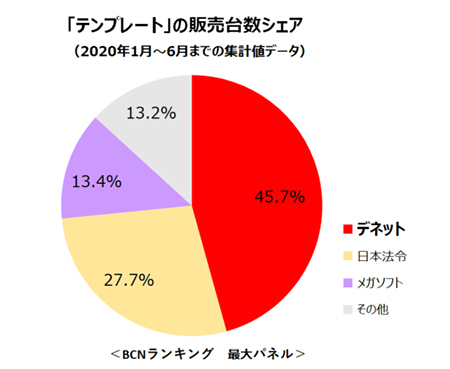 BCNランキングのテンプレートソフト部門で、デネットは強固な牙城を築いている。年間販売台数でシェアトップのベンダーを称える「BCN AWARD 2020」(2019年1~12月の集計)でも、50.5%で圧巻だった。看板商品である「価格表メニュー作成」や「販促チラシ印刷」という販促チラシのテンプレートソフトは、飲食店や小売業、病院など幅広い業種のユーザーから支持されている。必要なときに必要な枚数だけチラシがつくれる使い勝手の良さや、簡単な操作性などから、中小企業や小規模店の購入が多いという。