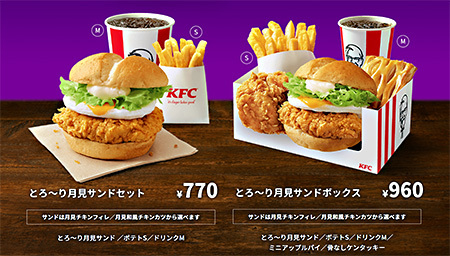 いずれかのとろ~り月見サンドにポテトS/ドリンクMを合わせた「とろ~り月見サンドセット」(770円)と、いずれかのとろ~り月見サンドにポテトS/ドリンクM/ミニアップルパイ/骨なしケンタッキーを合わせた「とろ~り月見サンドボックス」(960円)のセットメニューもある。