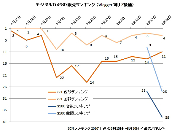 一方のパナソニックのG100は、発売直後の8月17日週では、販売台数シェアこそ28位とそこそこの売れ行きだったものの、販売金額では9位とトップ10入り。レンズ交換型であるためZV-1と異なるカテゴリだが、Vlogger向けという点では真正面からの競合製品。平均単価(同)も9万5300円と同レベルだ。