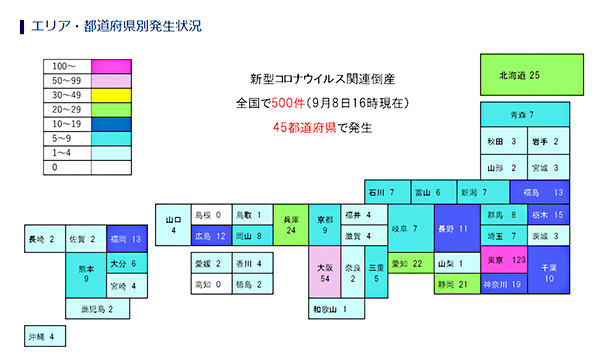 帝国データバンクが9月8日に発表した調査によると、新型コロナウイルスに関連する倒産の発生累計件数が全国で500件に上ったことが分かった。