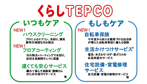 東京電力エナジーパートナー(東電EP)は、顧客の暮らしをサポートする「くらしTEPCO」のサービス拡充として、“いつもケア”に「ハウスクリーニング」と「フロアコーティング」を、“もしもケア”に「自転車保険」を追加し、9月10日に受付を開始した。
