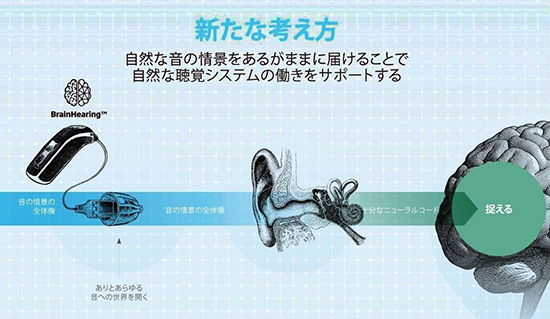 オーティコン補聴器(オーティコン)が有する聴覚の独立研究機関エリクスホルム研究センターが行った脳波検査(EEG)を用いた研究と、独立した第三者機関による脳滋図検査(MEG)、深部電極を使った研究に基づく聴覚分野での科学的な最新の知見によって、音を聞くための脳本来の働きを生かすために「周囲のありとあらゆる音の全体像」を届ける必要があることが明らかになった。