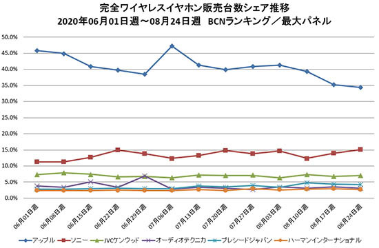 週次の販売台数シェア推移をみると、8月に入ってアップルのシェアが低下。7月6日週は50%に迫る勢いだったが、8月24日週は35%前後まで落ち込んでいる。それを受けて、2番手のソニーは15.0%まで上昇。3番手グループではまだ膠着状態が続いている。