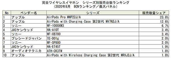 シリーズ別の販売台数シェアランキングでは「AirPods Pro」が23.8%で首位。前月からは4.2ポイント減となった。今後、注目したいのはボーズが10月に発売する2種類(ノイキャン搭載機とスポーツ向けモデル)の完全ワイヤレスイヤホンだ。AirPods対抗馬の一角として期待したい。(BCN・大蔵 大輔)
