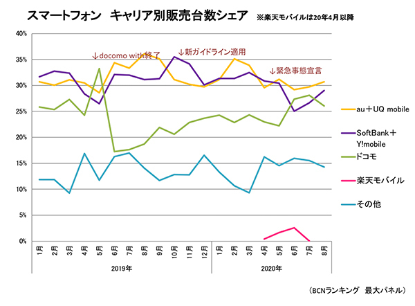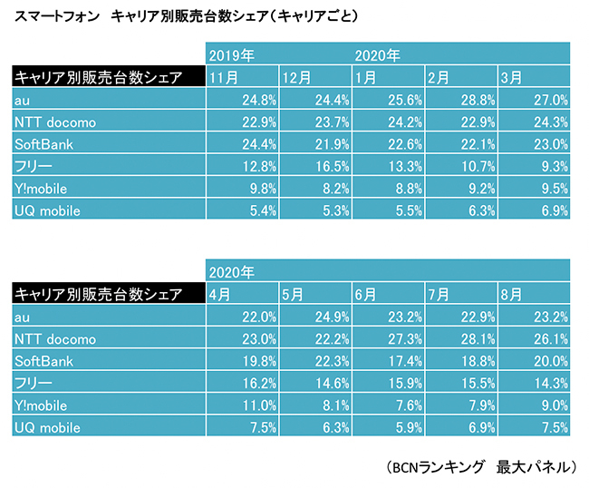 家電量販店の実売データを集計した「BCNランキング」によると、20年8月のスマートフォン全体(SIMフリーのiPhone、SIMフリーのAndroid端末などを含む)のキャリア別販売台数シェア1位は、au+UQ mobileを合算したKDDIグループ。僅差で2位にソフトバンクグループ(SoftBank+Y!mobile)がつけ、3位にサブブランドのないドコモと続く。