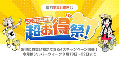 とらのあな通販 超お得祭は、毎月第3土日の週末(祝日が続く場合はその祝日も)を対象に、とらのあな通販で開催するお得なキャンペーン。記念すべき第1回目として、今月9月は19日から22日(火祝)までの4日間が対象となる。
