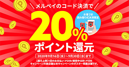 9月16日0時から、メルペイコード決済を利用すると、決済額の20%が翌日にポイント還元される「全国のお店を応援!メルペイ20%還元キャンペーン」が始まった。キャンペーン期間は9月30日23時59分まで。