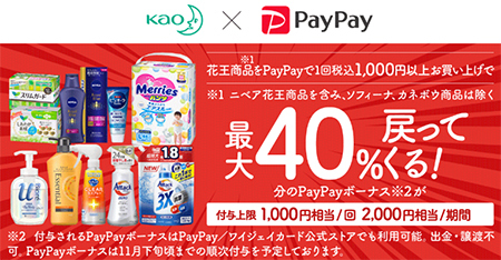 メーカー単独のコラボでは、「花王」の対象商品を税込み1000円以上購入すると最大40%分のPayPayボーナスを還元するキャンペーンに注目したい。還元上限は、1000円相当/回、2000円相当/期間。対象店舗はPayPayに対応するドラッグストアや家電量販店(一部を除く)。高還元なので日頃から使っている商品があるなら迷わず利用したいところだ。