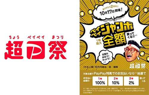 冒頭でも言及した「超PayPay祭」は、10月17日にスタートする。初日は、1日限定で抽選で決済金額の全額(100%)のPayPayボーナスを付与する「超PayPay祭!オープニングジャンボ」を開催。当選確率は「3回に1回」で、1等が100%還元、2等が10%還元、3等が2%還元となっている。
