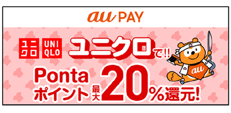 20%の高還元率キャンペーンを展開しているのがユニクロ。au PAY×ユニクロ キャンペーン! ユニクロにてPonta ポイント最大20%還元!」を開催している。還元上限は800ポイント/回、3000ポイント/期間。ユニクロオンラインストアやジーユーは対象外という点に注意してほしい。