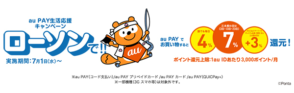 ステータスによって還元率が変動する「ローソンでau PAY ご利用で誰でもポイント増量中!」もまだまだ開催中。ローソンでau PAY(コード支払い)、au PAY カードなど、対象の支払い方法で支払うと4%、毎月3日・13日・23日の「三太郎の日」が誰でも7%、auユーザーが10%、「auスマートパスプレミアム会員」がそれに3%上乗せして還元する。ポイント還元上限は3000ポイント/月。