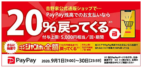 これによって、吉野家通販ショップは9月30日までPayPayが実施している「またまたオンラインがお得!10%戻ってくるキャンペーン」の対象店舗になった。さらに、通常よりも付与率が高い20%還元の対象になっているので、抽選で最大100%還元になる「PayPayジャンボ(オンライン)」と組み合わせれば、最大120%還元のチャンスとなる。なお、店頭では同キャンペーンが適用されないので注意したい。