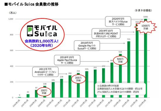 500万人を突破するまでに約11年を要したが、さらに500万人を突破するまでに約3年だったことからも、背景にはここ1、2年のキャッシュレス決済の急激な普及がある。その間、19年10月にJRE POITNがたまるサービスを開始したり、20年5月に楽天ペイに対応したりなどにも取り組んでいる。