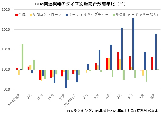 コロナ禍で生まれたテレワーク需要や巣ごもり需要で、売り上げを伸ばしている製品群の一つがDTM(Desk Top Music)関連機器だ。コンピューターを活用した音楽制作用機器を中心とした市場だが、好調を維持している。特に、販売が伸びているのはオーディオキャプチャー(オーディオインターフェース)。BCNランキングの集計では、3月に前年比149.7%と売り上げが急増。5月に204.6%、6月に228.6%増と倍増以上の勢いだ。