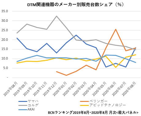 8月のメーカー別販売台数シェアは、ヤマハ15.8%で首位。品薄が続いていた、ストリーミング配信向けのミキサーAG03の生産がようやく回復しつつあり、トップシェア獲得に寄与した。