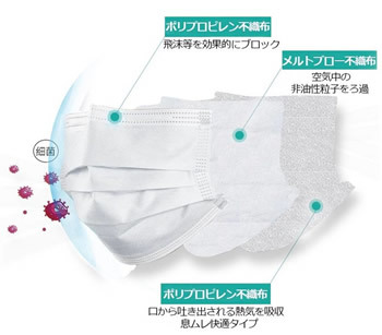 一般用メルトブロー式不織布マスクは、個人用の使い捨てタイプのマスク。3層構造でウイルス飛沫をブロックする。安価な3層構造のマスクのなかには、3枚全てに同じ材質が使われており、ウイルス飛沫が通過してしまうものもあるが、同品は、2枚目にメルトブローを利用している。