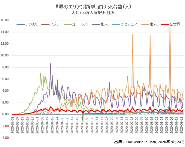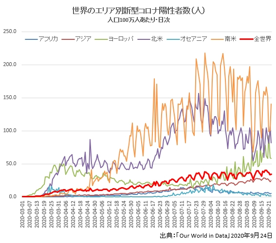 地域別にみると、特徴的な動きをしているのがヨーロッパ。イタリア、スペイン、イギリスなど、第一波で大きな被害を受けた国が多いエリアだ。陽性者数が4月38.0人、死者数が4.7人だった。一方、9月に入り第2波が襲来。直近陽性者数は、4月を上回る53.2人。しかし、死者数は4.7人から0.5人と激減。感染症をうまくコントロールしつつある状況だ。