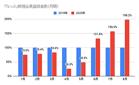 なっぷの新規会員登録者数は、4月7日の緊急事態宣言以降大きく落ち込んでいたが、6月以降急激に回復し、8月は前年の2倍近くの登録者数となった。withコロナ社会での新しいレジャーとしてキャンプのニーズが高まったことが、新たにキャンプを始めるユーザーの増加につながっているものと思われる。