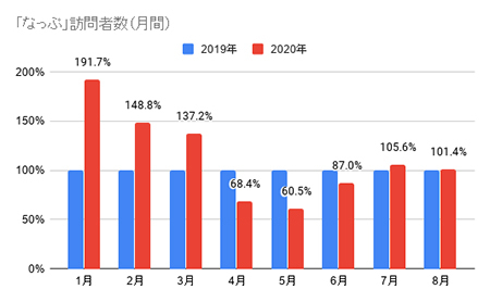 なっぷの訪問者数は、4~6月までは新型コロナウイルス感染拡大による外出自粛の呼びかけや緊急事態宣言の影響もあり前年を下回っていたが、7月以降は回復傾向にあり、前年超えとなった。