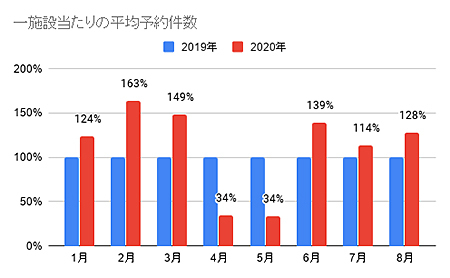 一施設あたりの平均予約件数は、4月7日の緊急事態宣言以降大きく落ち込んでいたが、新規登録会員数同様、6月以降は急激に回復し、前年超えとなった。新型コロナウイルス感染拡大防止のため、ユーザー同士の距離を保つ措置として一施設あたりの受け入れ組数・人数を制限している施設も多いことを考えると、伸び率の大きさがうかがえる。